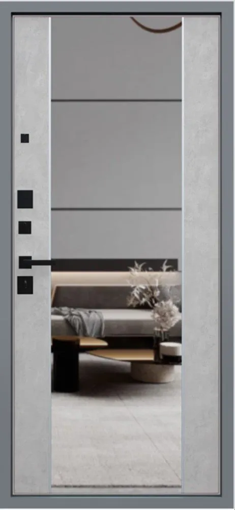 Экошпонированная панель МДФ 16 мм. Цвет "бетон светлый". Большое зеркало. Вставки из вертикальных молдингов по краям зеркала (цвет "матовый хром").
